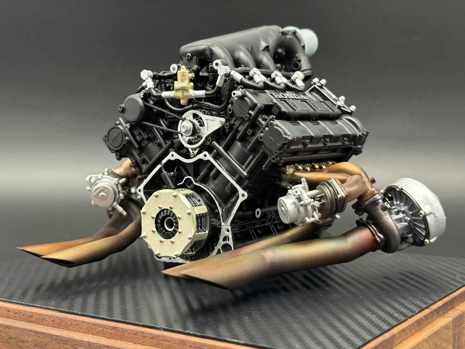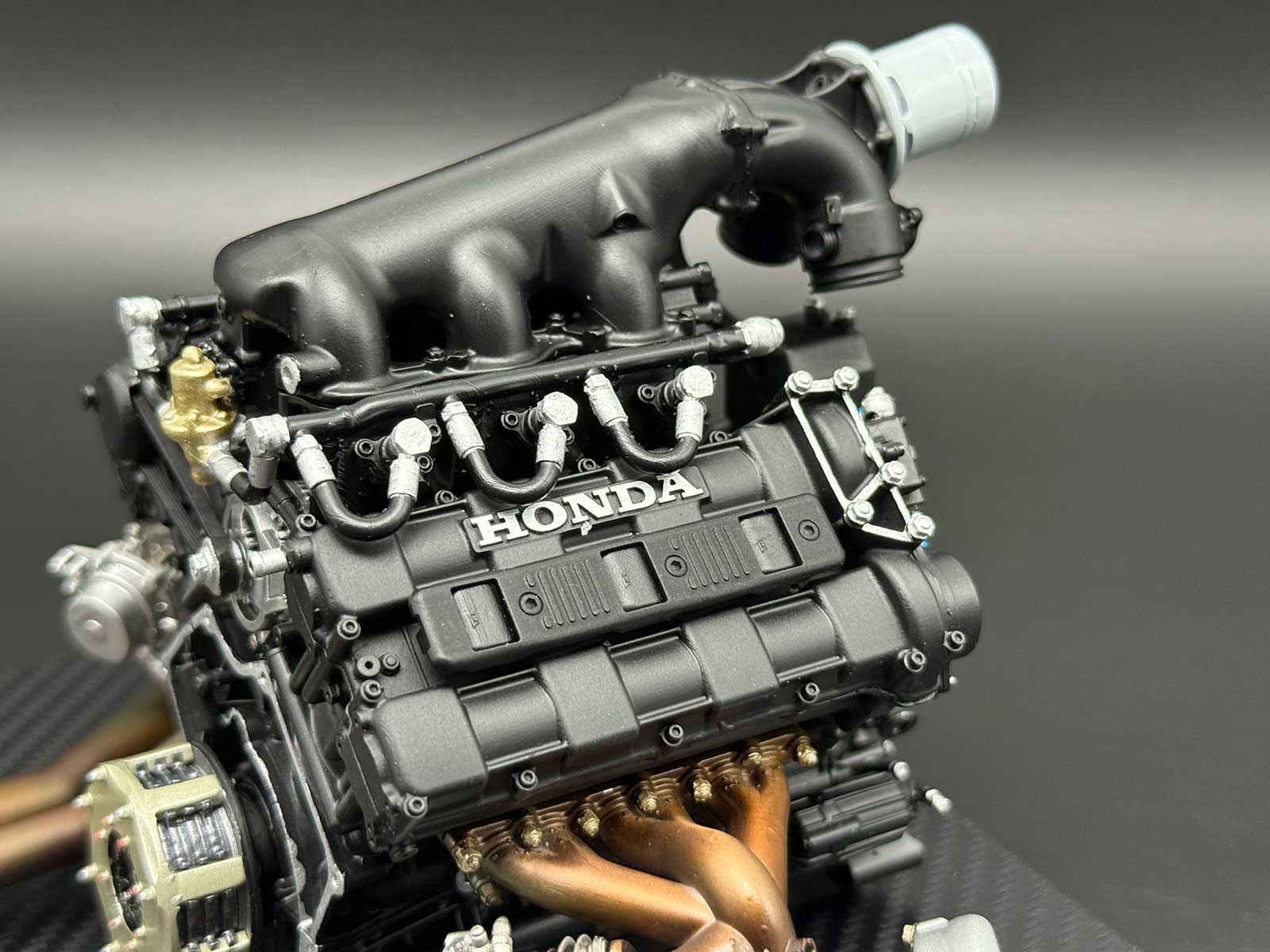 本モデルはホンダの全面協力のもと製作されました。もてぎのコレクションホールに収蔵される実機のR168Eエンジンを取材しホンダより3Dデータの協力や部品など三次元スキャニングでデータ化し、モデリング。主要部品は、従来の原型造形を用いた精巧なレジン成型で、周辺の補器類(ショートパーツ)は最新の高精度3Dプリンターを使用し、細部まで忠実にスケールダウンすることが可能となりました。