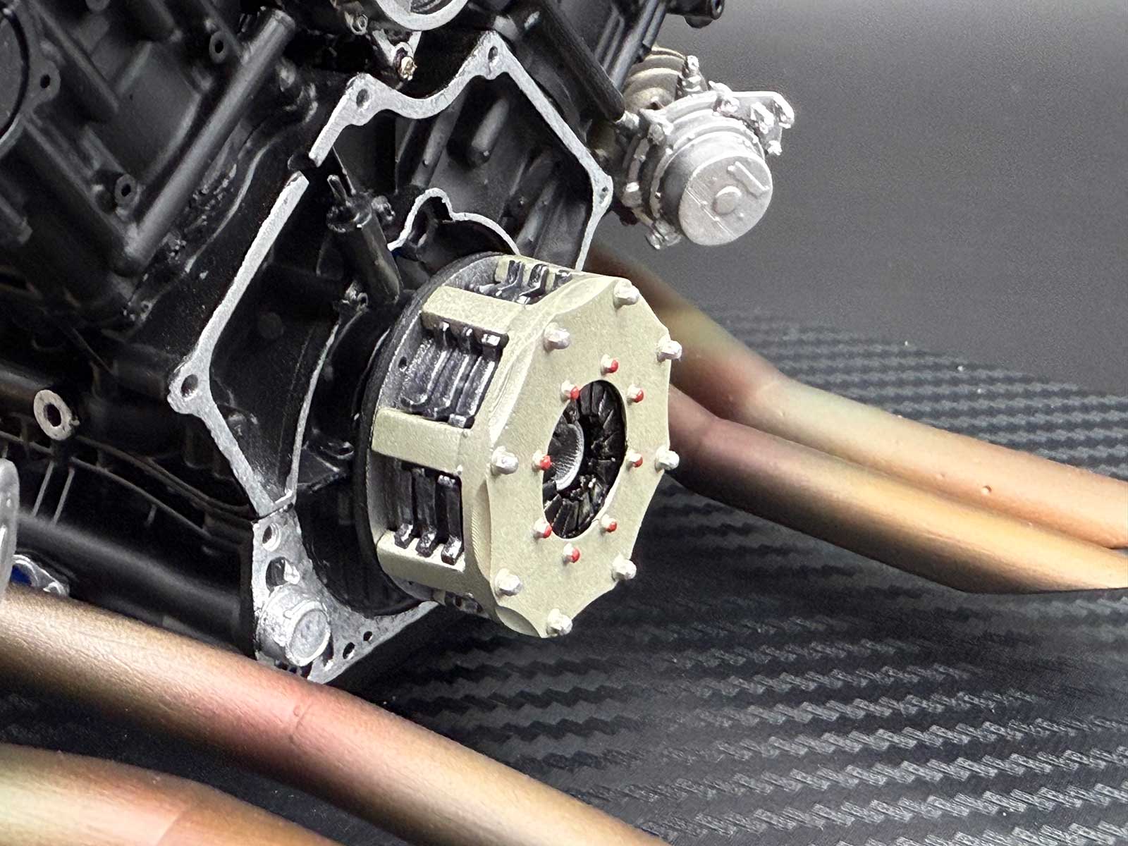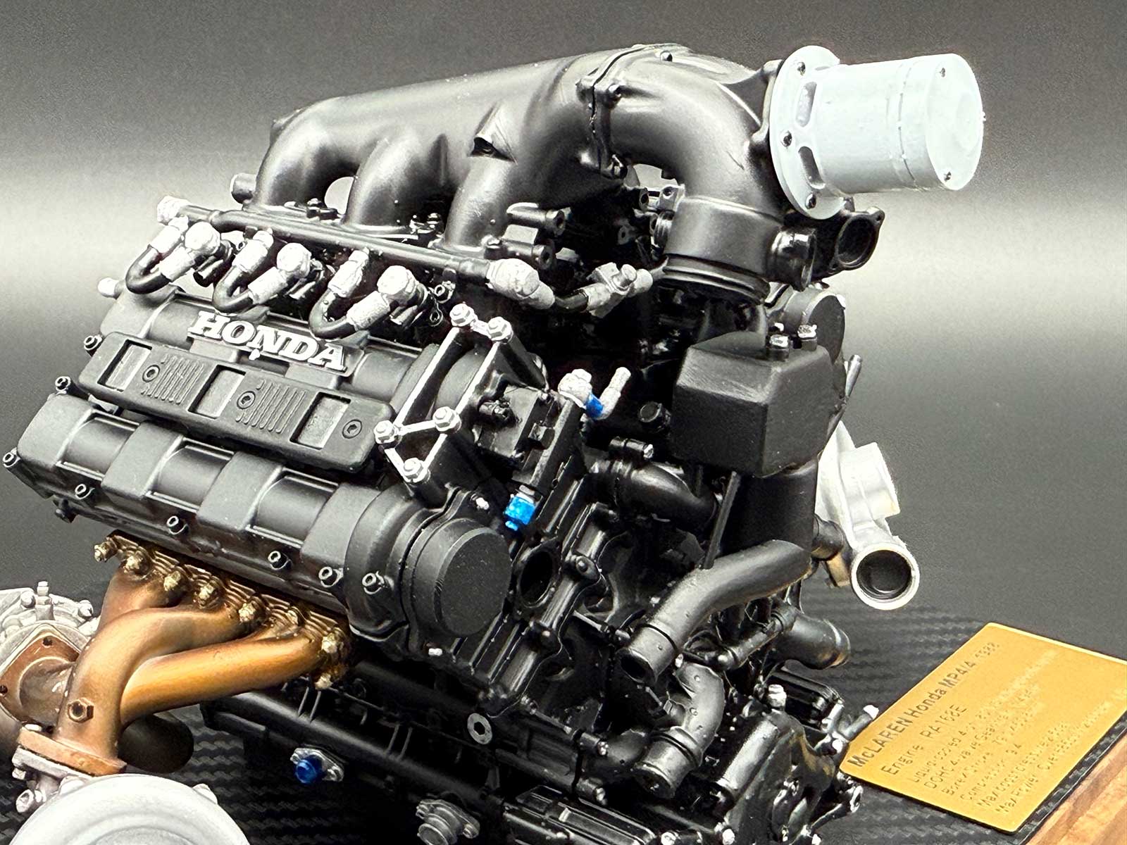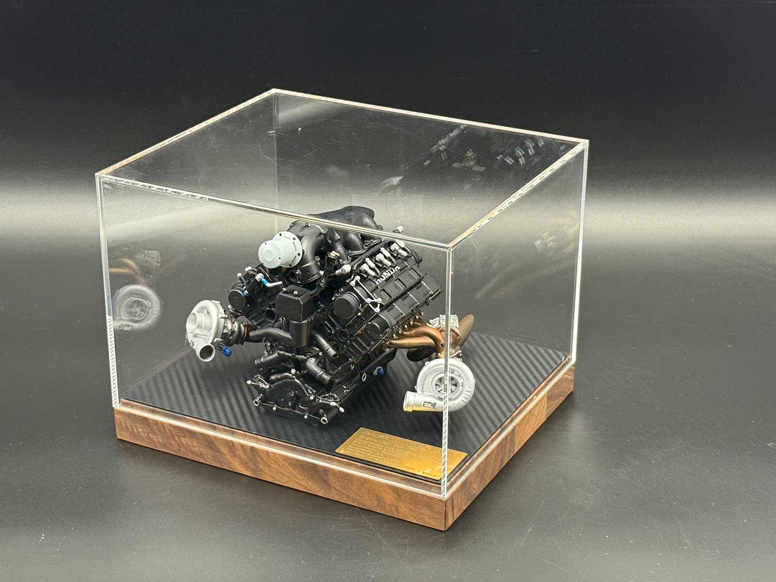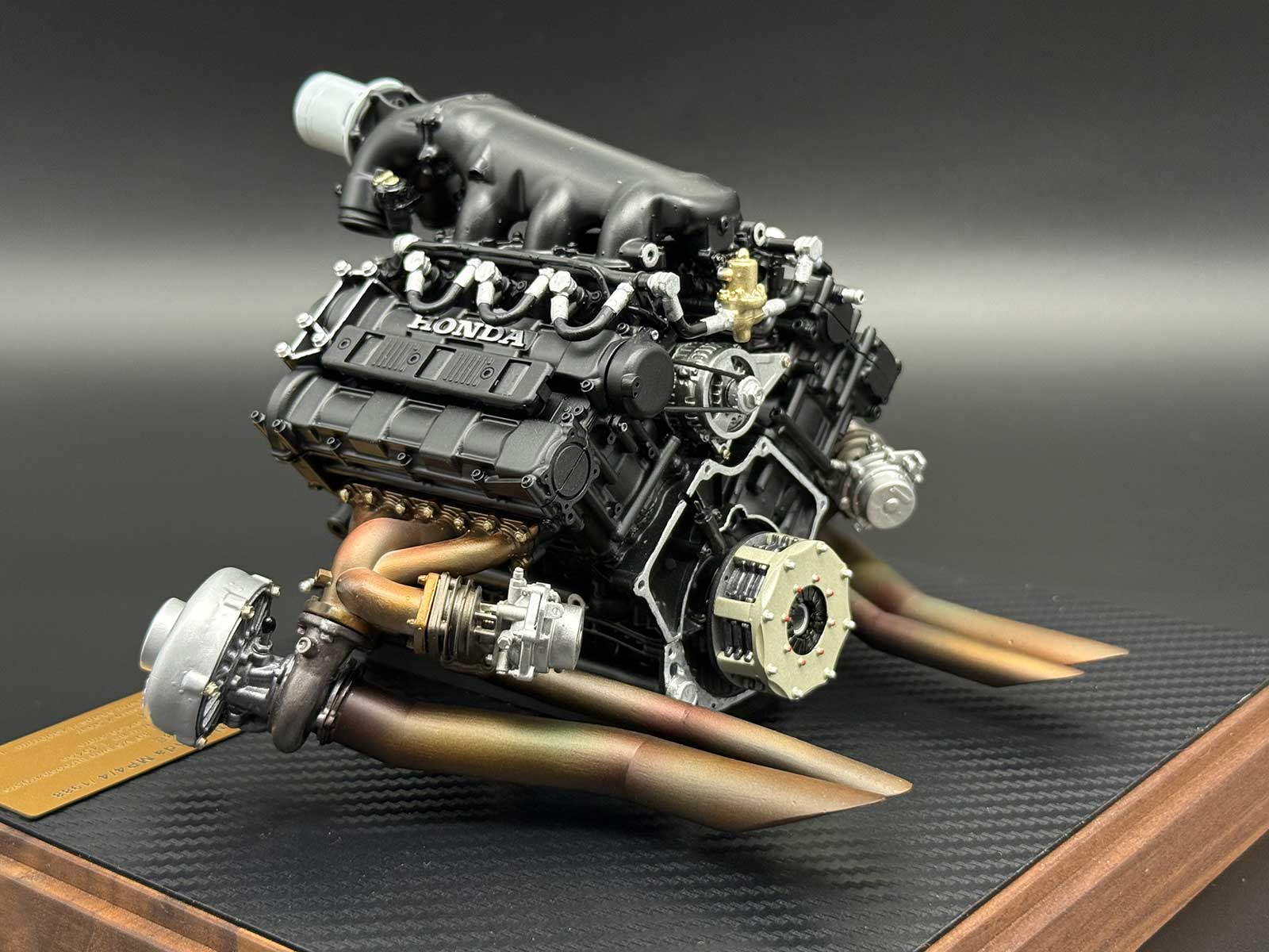 本モデルはホンダの全面協力のもと製作されました。もてぎのコレクションホールに収蔵される実機のR168Eエンジンを取材しホンダより3Dデータの協力や部品など三次元スキャニングでデータ化し、モデリング。主要部品は、従来の原型造形を用いた精巧なレジン成型で、周辺の補器類(ショートパーツ)は最新の高精度3Dプリンターを使用し、細部まで忠実にスケールダウンすることが可能となりました。