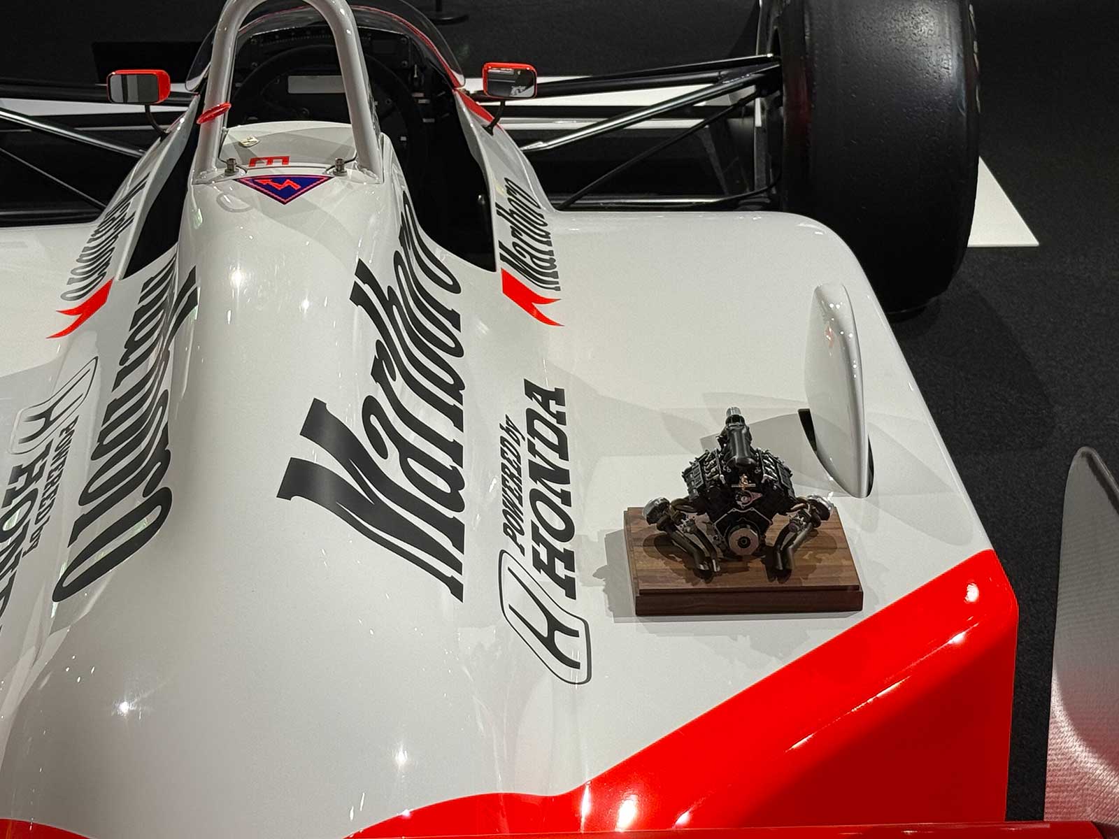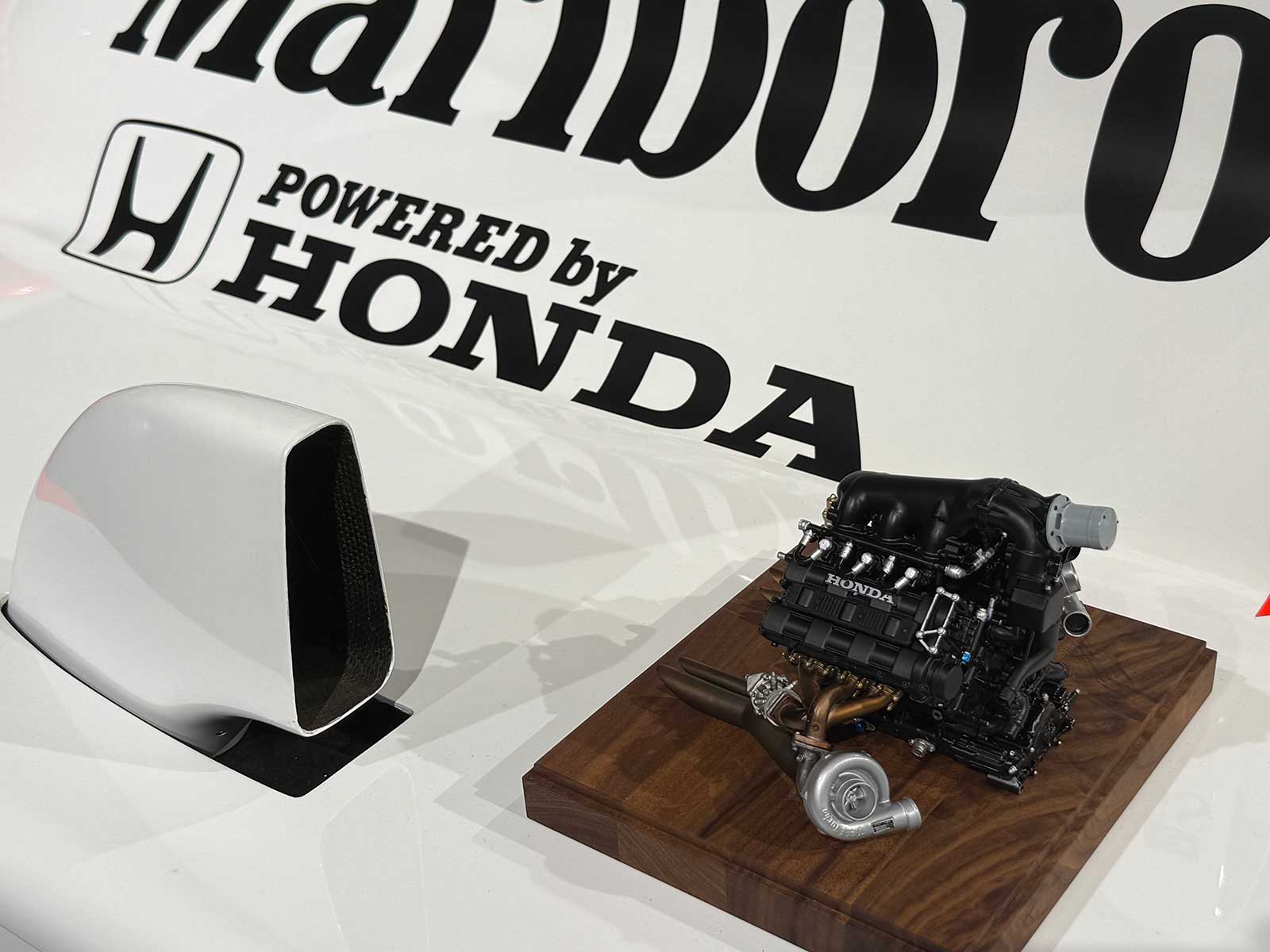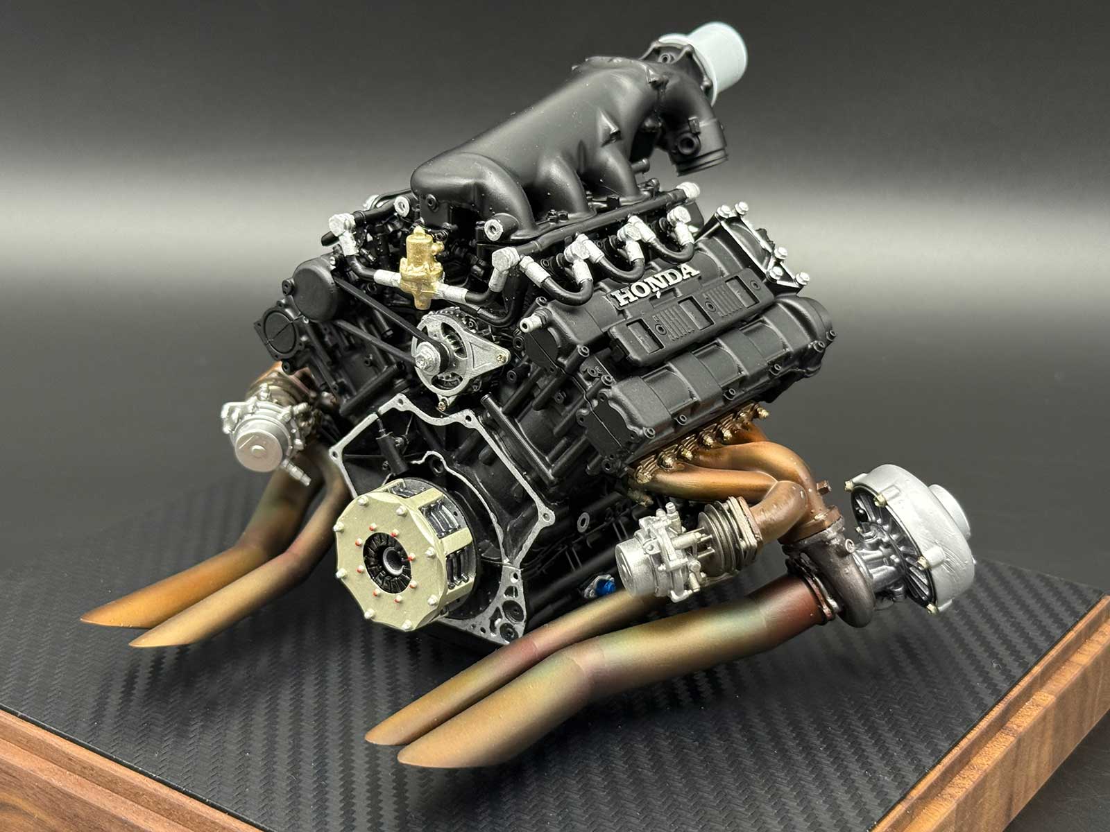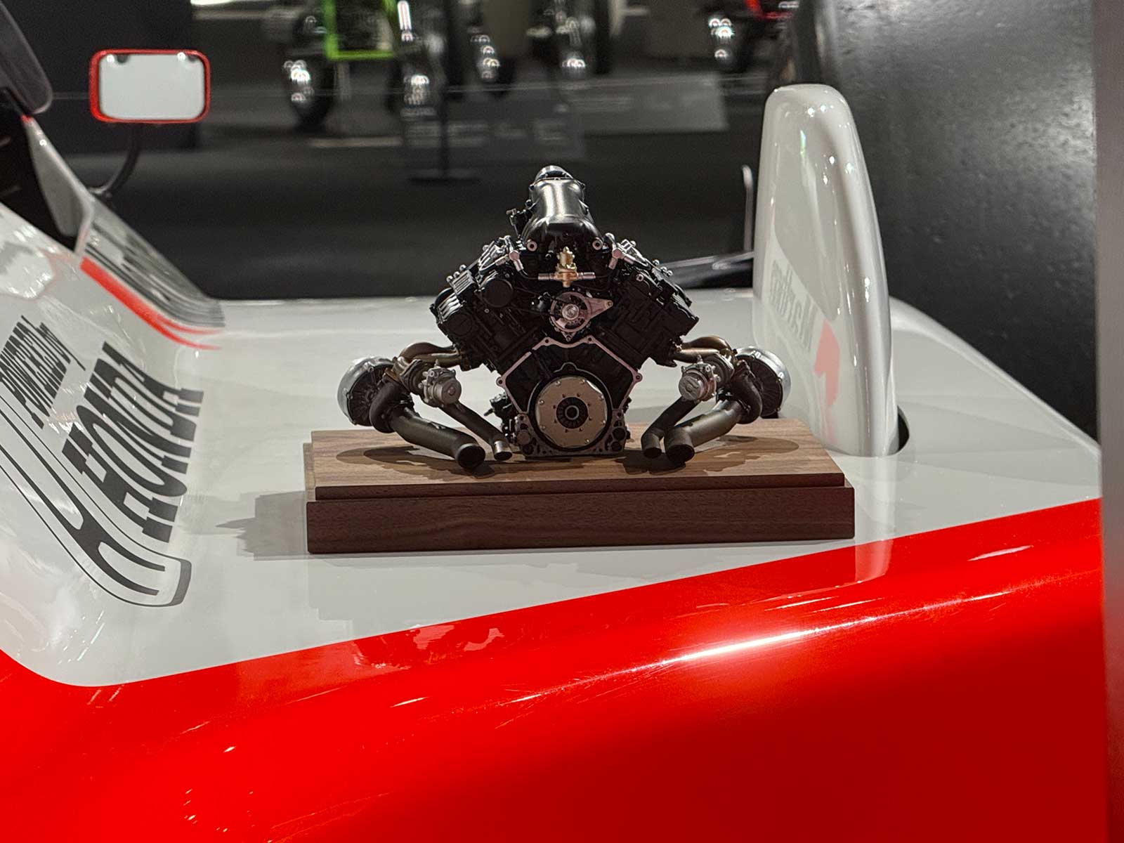 カラーリングについてもHRC (Honda Racing Corporation)と綿密に擦り合わせ、と確認作業を経て決定。とくに見応えのあるのが、両バンクから外側に張り出したうねりのあるエキゾーストマニフォールドと大径サイズのターボチャージャー。コンパクトなエンジン本体との対比で、補器類の存在がより際立って見えるのも特徴です。